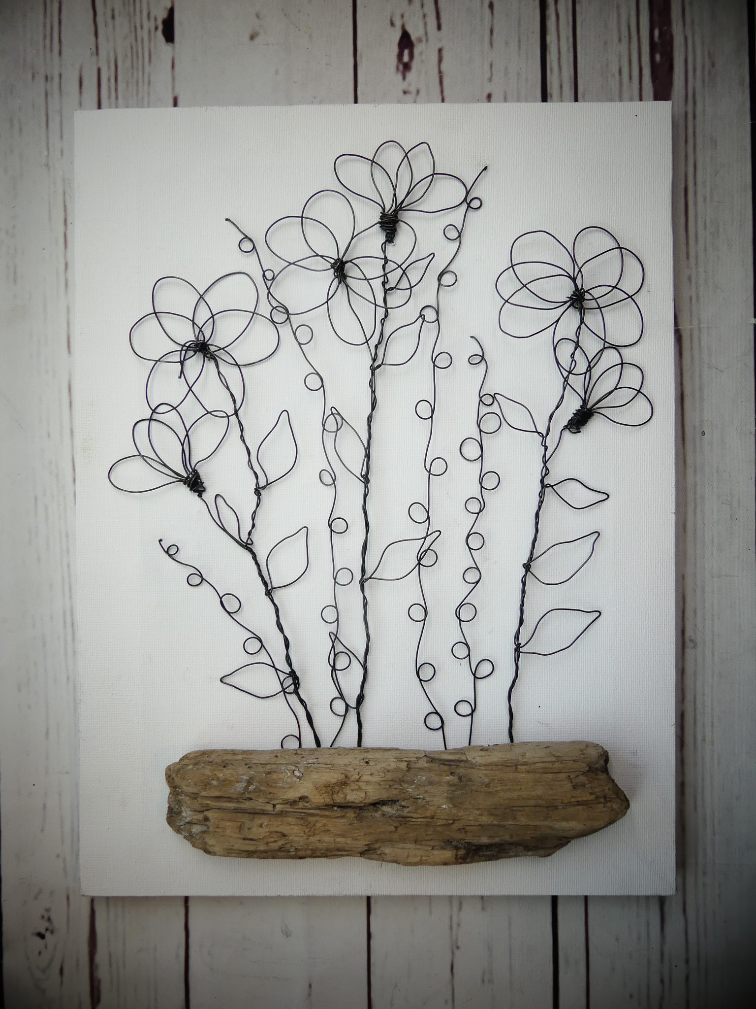 This Wire Flower Art Bouquet makes a sweet and cheerful addition to any room in your home. The canvas measures 12x16 and the Flowers are made with heavy black steel wire. The Driftwood is locally sourced here in beautiful, Alberta!